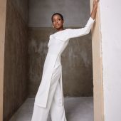 knee length bow blouse with matching trousers.